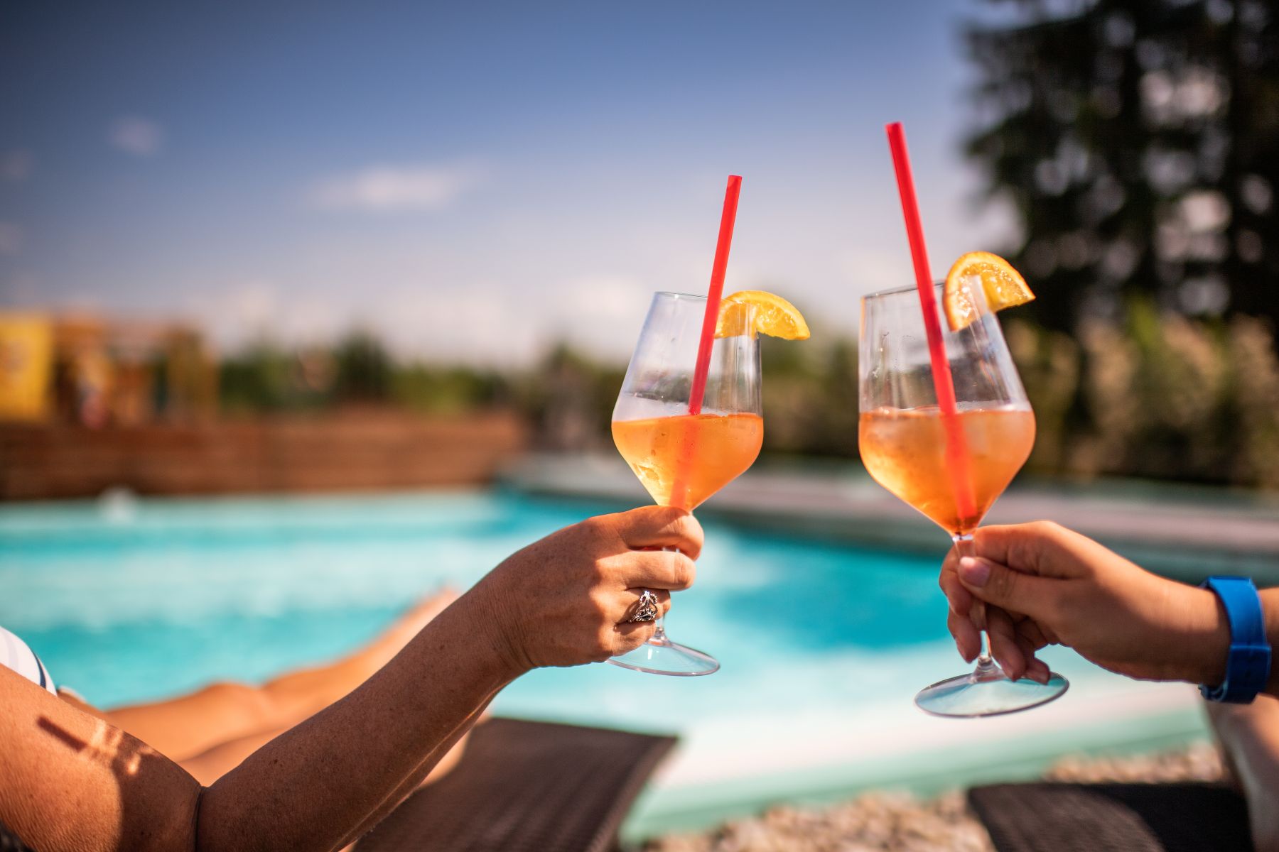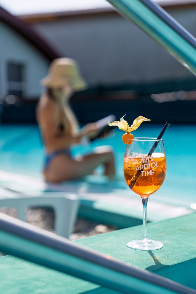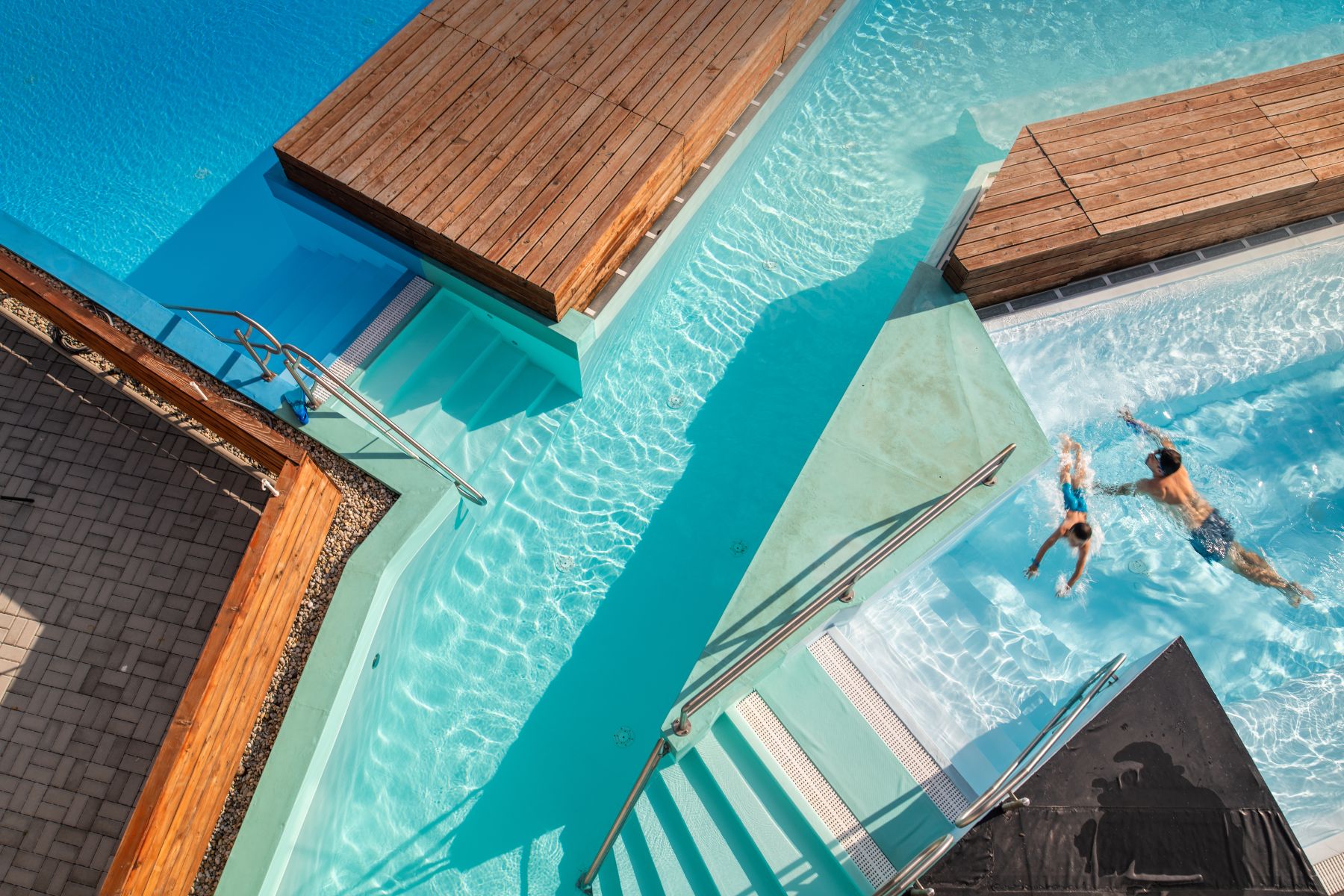 - Relaxační bazén – teplota 30–34 °C, ideální pro klidné chvíle na slunci, hloubka 1,1 m